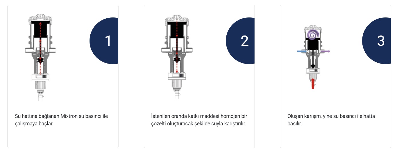Özel olarak hayvancılık sektörü için tasarlanmış olan Mixtron'un orantılı hacimsel dozaj pompaları, hayvancılık yönetimi konusunda uzmanlaşmış teknisyenlerin ve veteriner hekimlerin yardımıyla canlıların sağlıklı ve düzgün büyüme ve gelişmesini desteklemek için uygulanacak maddelerin (vitaminler, antibiyotikler, probiyotikler, mineraller, aşılar) dozajı ve hazırlanabilmesi amacıyla geliştirilmiş ve ince ayarlanmıştır.